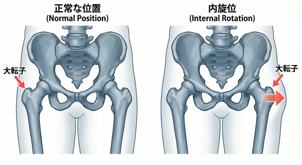 大転子が外に張り出す原因は、「股関節の内旋(内股)」です。 股関節が内側にねじれると、解剖学的な構造上、大転子は外側に突き出します。