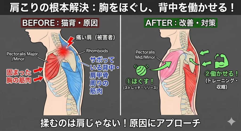 肩こりも同様です。猫背になり、頭が前に突き出た姿勢(スマホ首・ストレートネック)が続くと、ボーリングの球ほどの重さがある頭を支えるために、首や肩の筋肉が常に緊張状態になります。 この場合、揉むべきは肩ではなく、猫背の原因となっている「固まった胸の筋肉」をほぐし、サボっている「背中や肩甲骨周りの筋肉」を働かせることです。