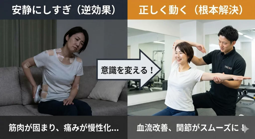 その経験から断言します。慢性的な腰痛や肩こりのほとんどは、「安静」にしていても治りません。むしろ、「正しく動かさないこと」が痛みを長引かせている最大の原因なのです。